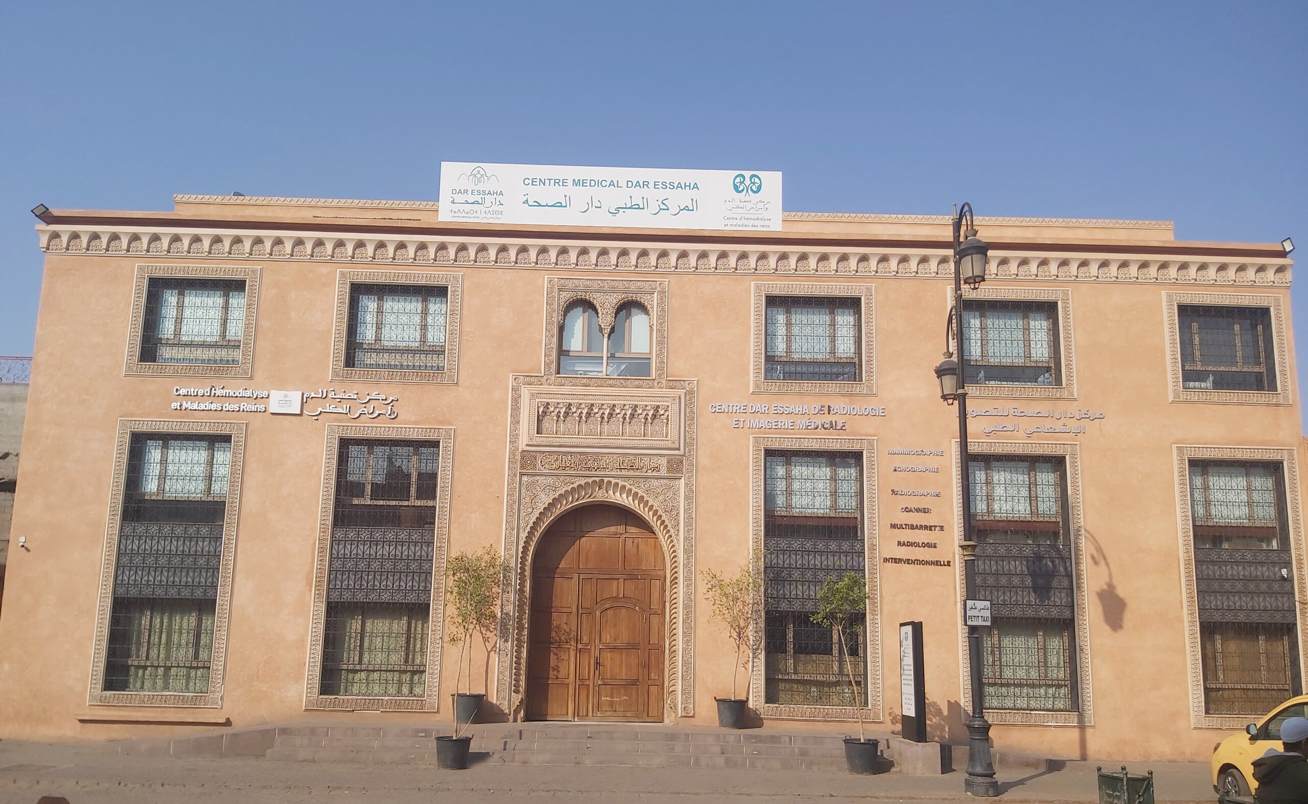 Parmi ses éléments distinctifs : façade en design islamique caractérisé par Tadellakt et les arcs en fer à cheval, atrium central évoquant les riads avec fontaine numérique, et salles d’examen aux volumes épurés, protégées par des claustras high-tech filtrant la lumière comme les anciens moucharabiehs, offrant confort, sérénité et efficacité.