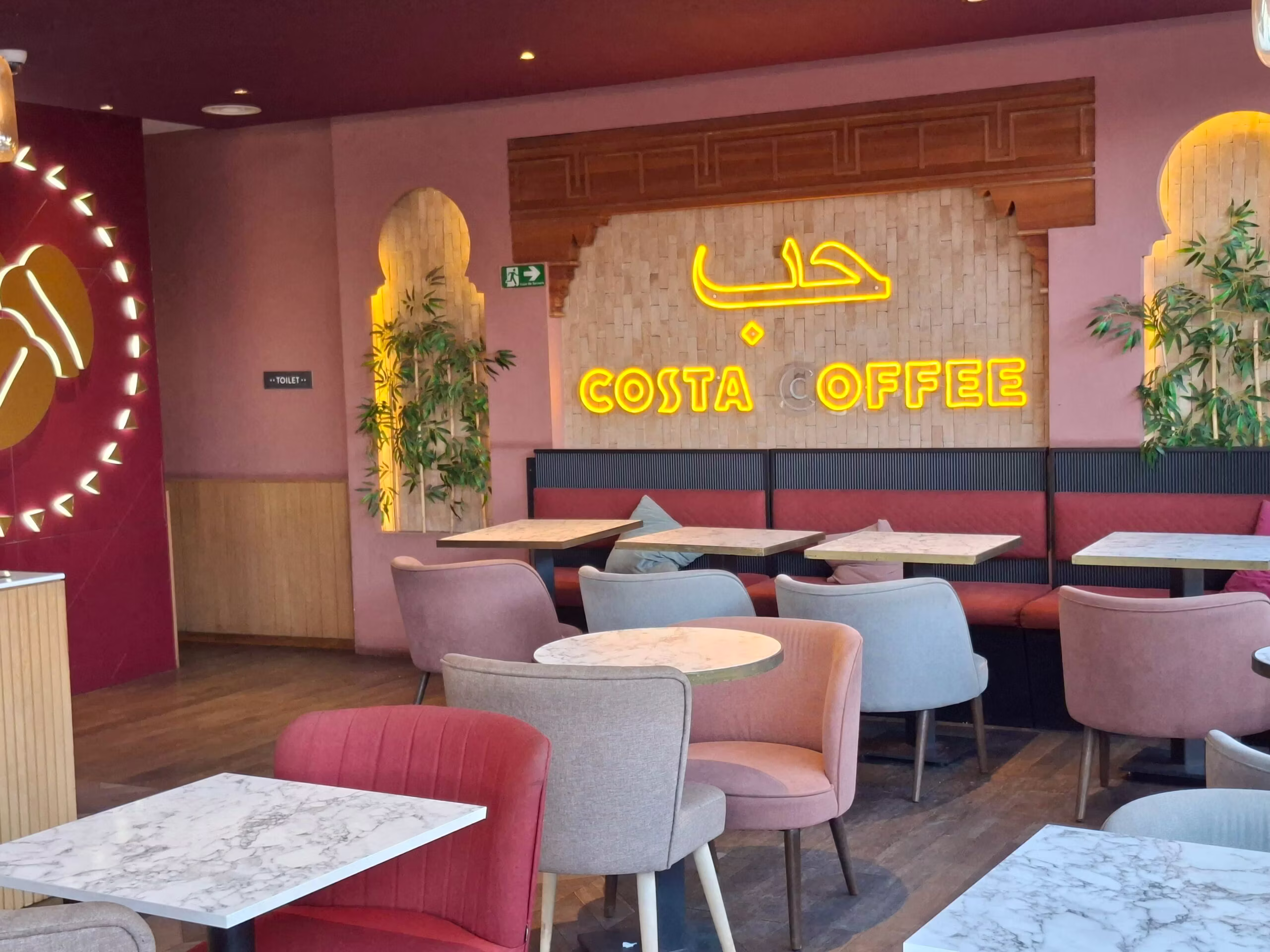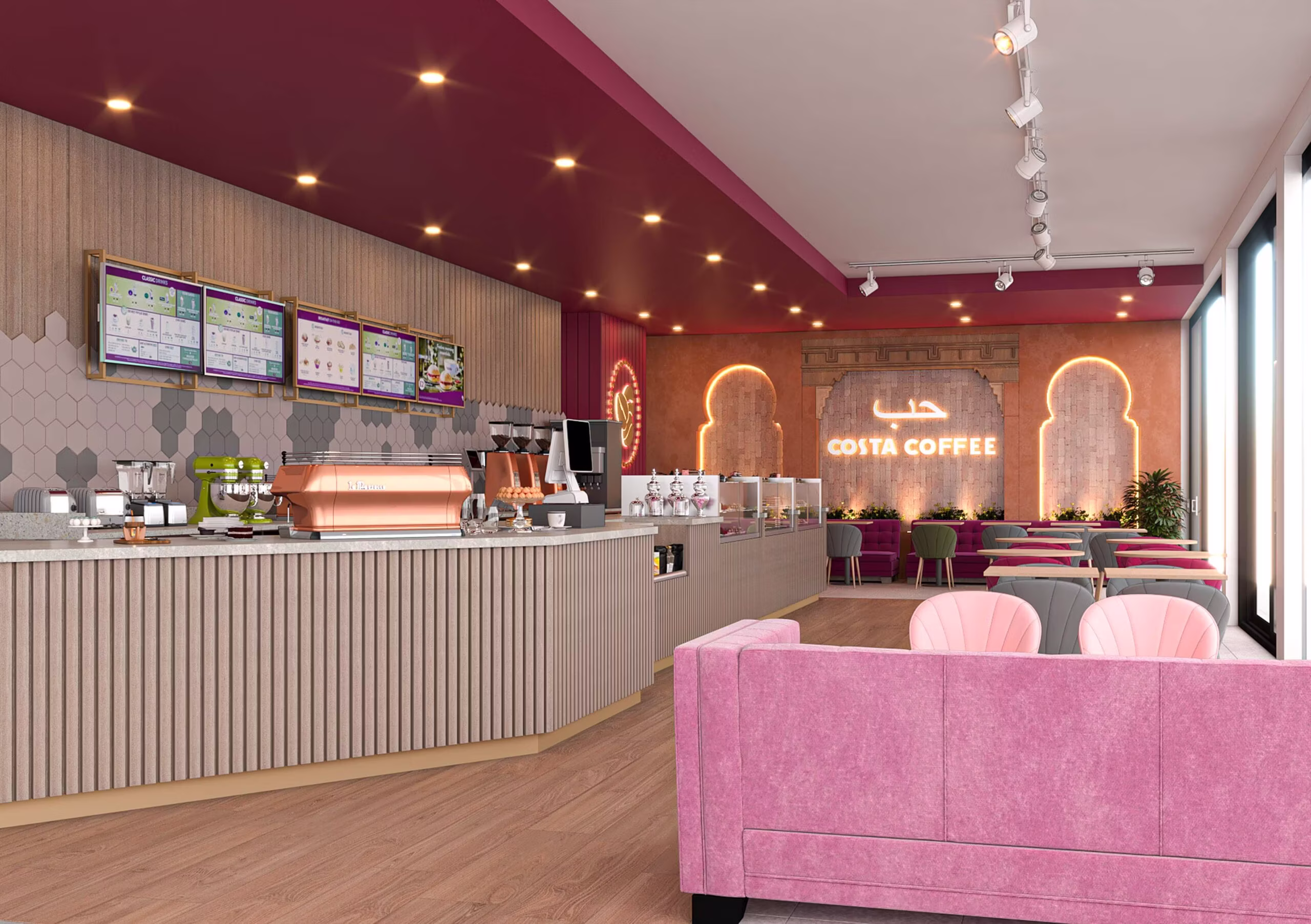 Le projet COSTA Coffee crée un espace de 90 à 120 m² combinant fonctionnalité, confort et identité visuelle forte. Le design intérieur allie l’univers iconique de Costa Coffee — bois clair, typographie, couleurs chaleureuses — à des touches locales adaptées au climat et au site.