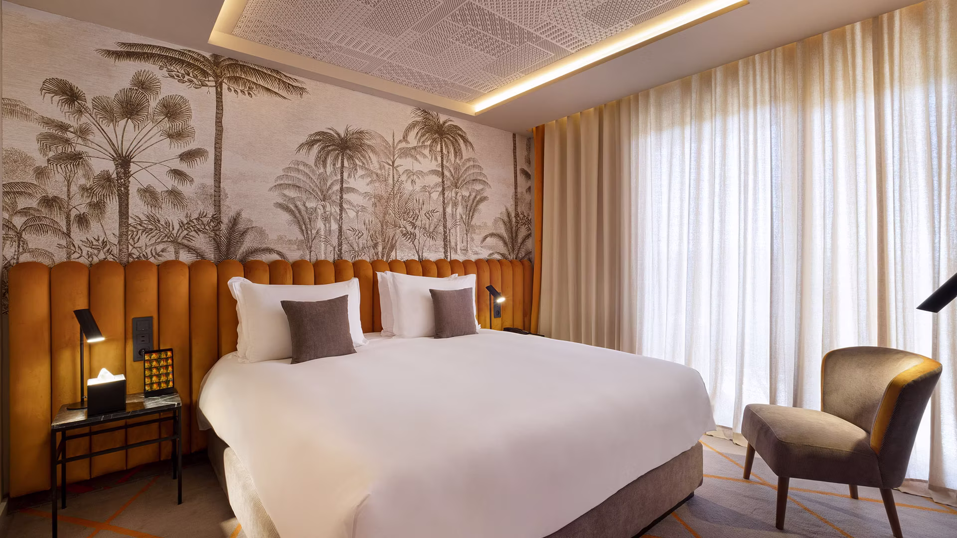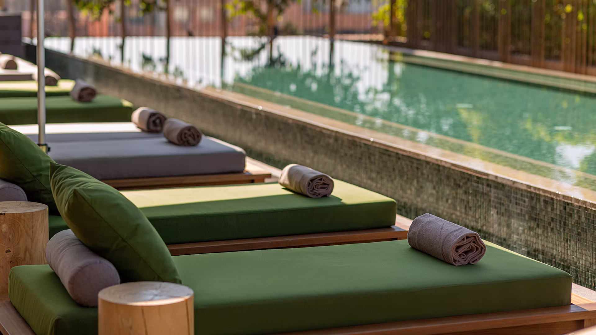 Les 162 chambres sont réparties dans des bâtiments aux toitures terrasses, offrant des vues dégagées sur le jardin central. L’ensemble architectural intègre également des espaces de loisirs et de bien-être : piscine principale, rooftop panoramique, spa, zones de détente et installations sportives (padel, yoga, parcours de santé), harmonisées avec le paysage.
